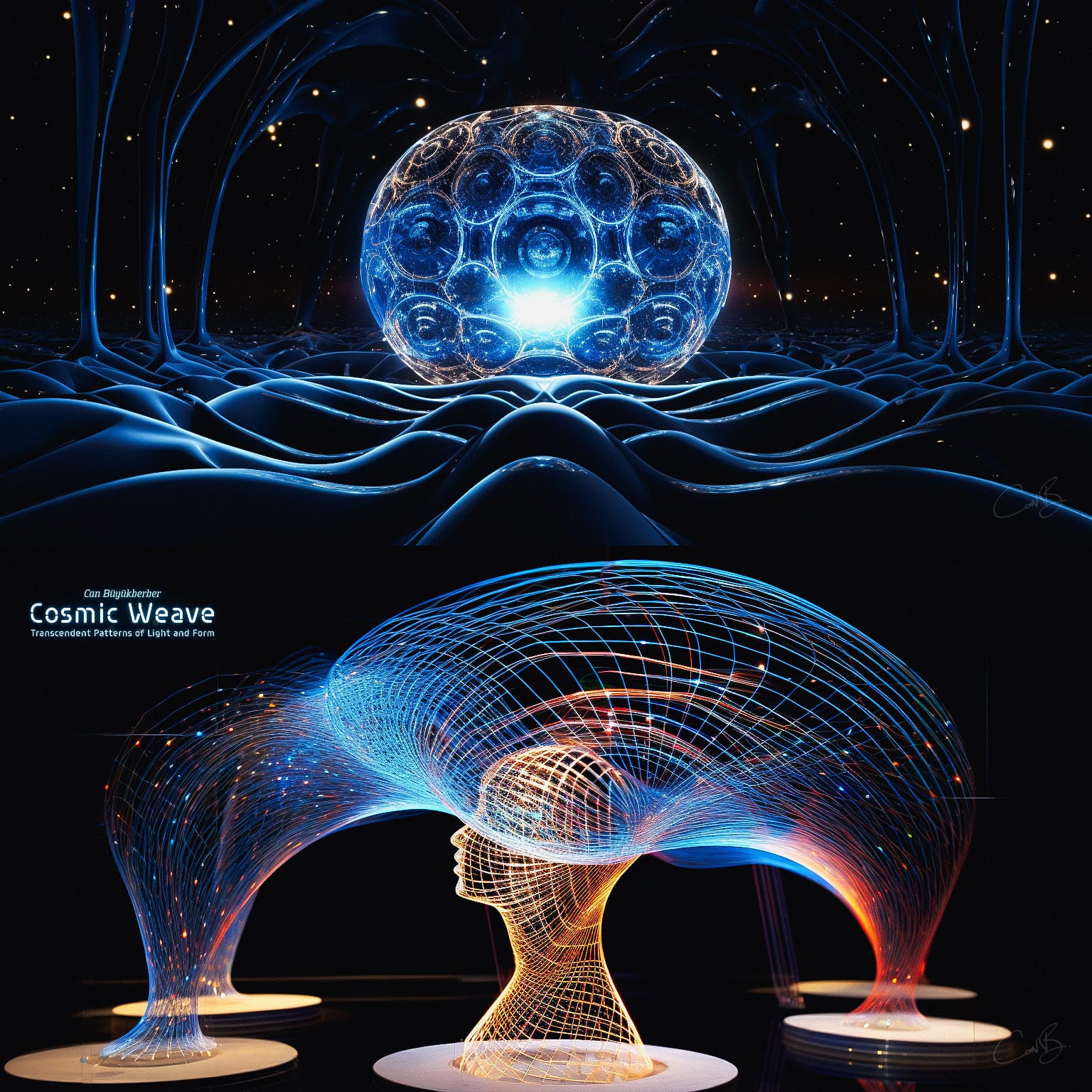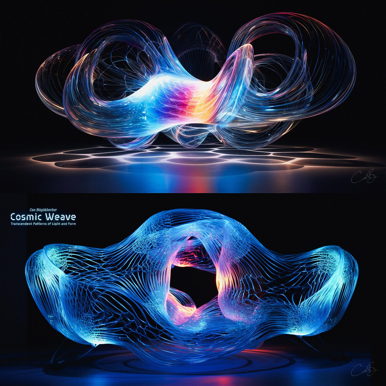 In "Cosmic Weave", Can Buyukberber offers a refreshed interpretation of his pieces from the "Luminous" and "Multiverse" series. This collection of digital sculptures unravels the intricate tapestry of the universe, inviting viewers into a realm where the mysteries of higher-dimensional spaces, futurism, and the foundations of physics merge with the sensibilities of contemporary digital artistry.